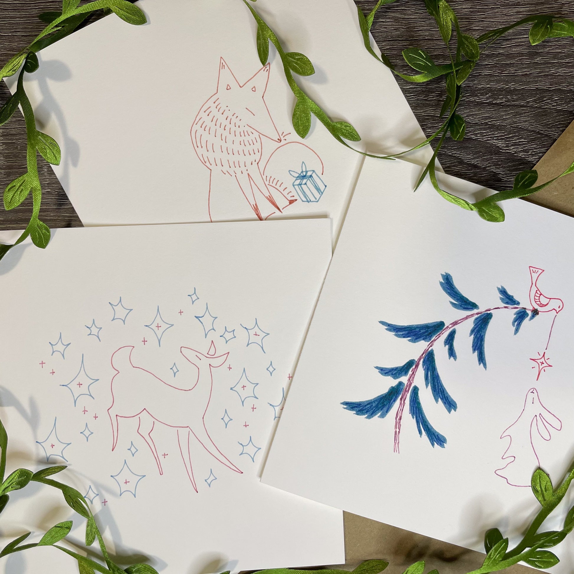 A collection of 5x5 greeting cards featuring small, holiday themed doodles. Simple and colorful, these can add a dash of fun to your holiday messages!