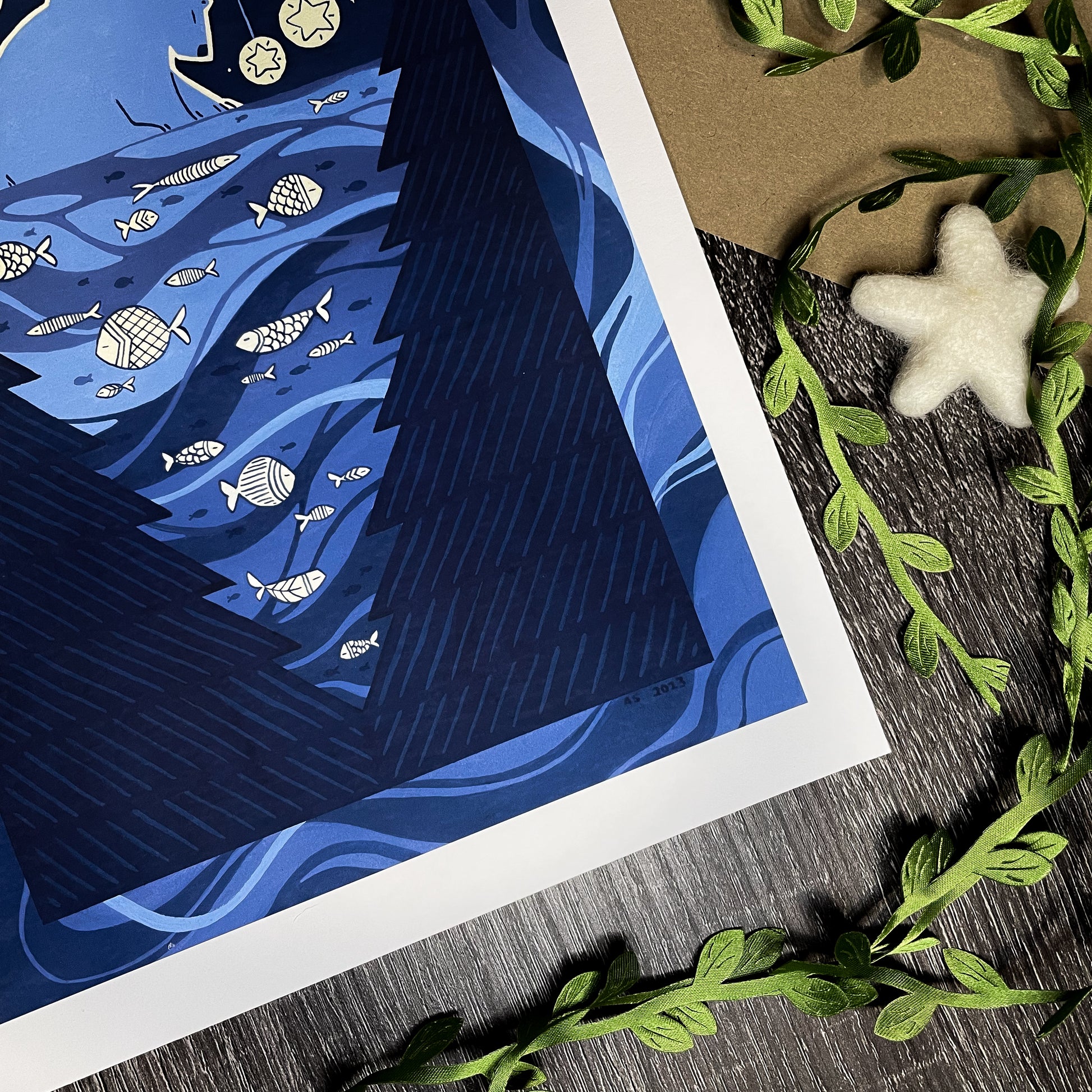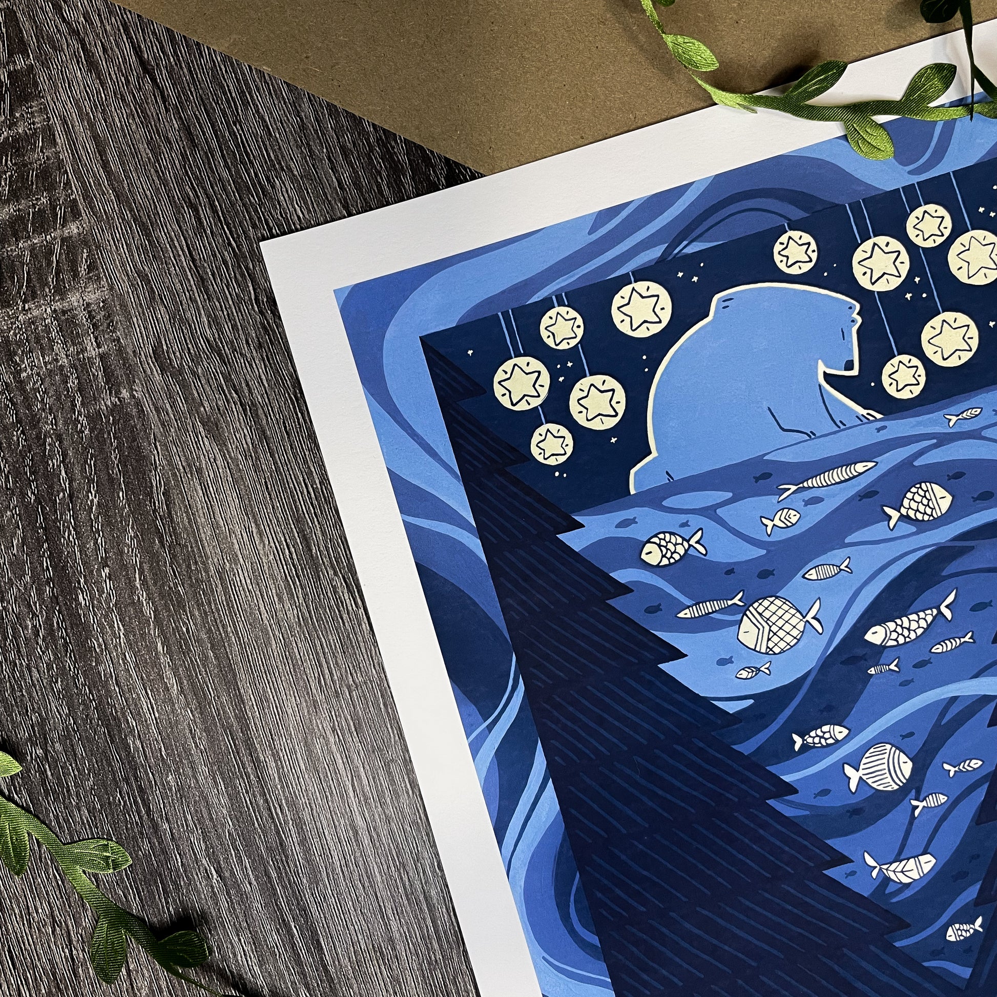 A bear stares down into a pool of starry fish, contemplating. Print is available in two sizes, 8x10 inch and 11x14 inch.